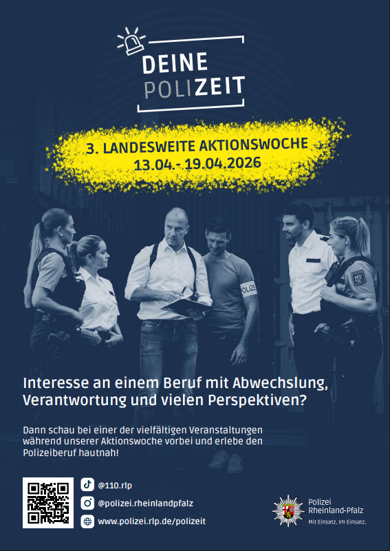 Die Polizei Rheinland-Pfalz lädt vom 13. bis 19. April 2026 zur landesweiten Aktionswoche „Deine PoliZEIT“ ein. Interessierte erwartet eine Woche mit spannenden Einblicken, persönlichen Erfahrungen und direktem Austausch mit Polizeibeamtinnen und Polizeibeamten.