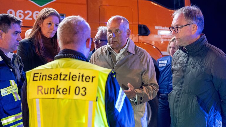 Innenminister Roman Poseck gemeinsam mit Landrat Michael Köberle sowie Bürgermeisterin Antje Hachmann im Gespräch mit dem Einsatzleiter. Bild: Frank Zinn / HMdI