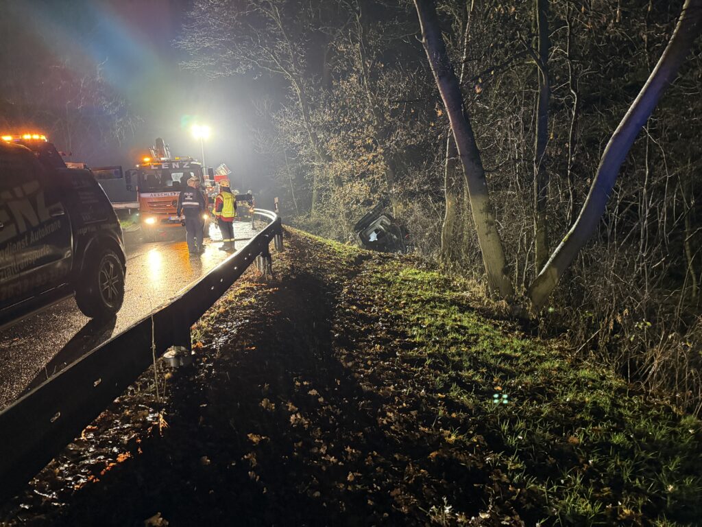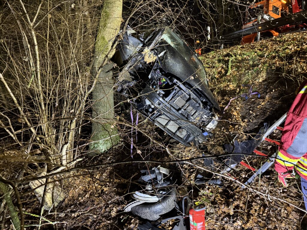 Am Mittwoch, dem 31. Dezember, wurde um 19.45 Uhr ein Verkehrsunfall auf der L 304 gemeldet. Ein Transporter kam in einer Linkskurve nach rechts von der Fahrbahn ab, durchbrach die Schutzplanke und rutschte eine Böschung hinunter, bevor er gegen einen Baum prallte.