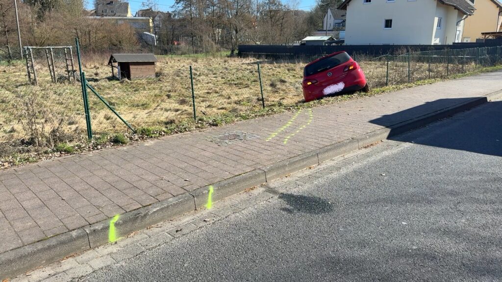 Am Montag, 2. März 2026, kam es gegen 12:00 Uhr in der Bahnhofstraße zu einem Verkehrsunfall, bei dem ein roter Opel Corsa von der Fahrbahn abkam und mit einem Grundstückszaun kollidierte.